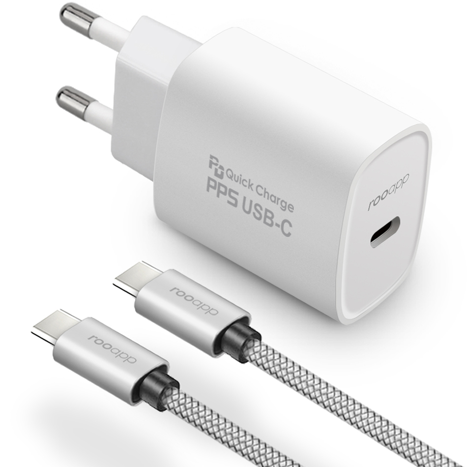 루앱 25W PD C타입 PPS 초고속 충전기 어댑터 + 메탈 60W 고속 충전 케이블, 화이트 x 실버 1세트